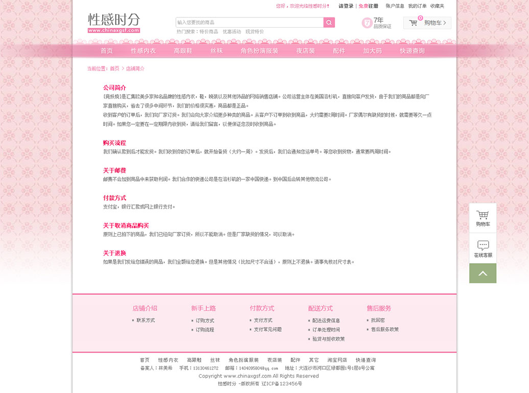 性感时分是专门销售和介绍美国性感内衣,丝袜,角色扮演服装和性感高跟鞋的店铺。总部在美国洛杉矶,在中国大连设有转运站。由于大部分商品都从美国发货,所以我们可以提供种类繁多的商品供您选择。我们代理的品牌包括(单不仅限于):Leg Avenue, Dreamgirl, Music Legs, Seven 'til Midnight, Allure, Elegant Moments...