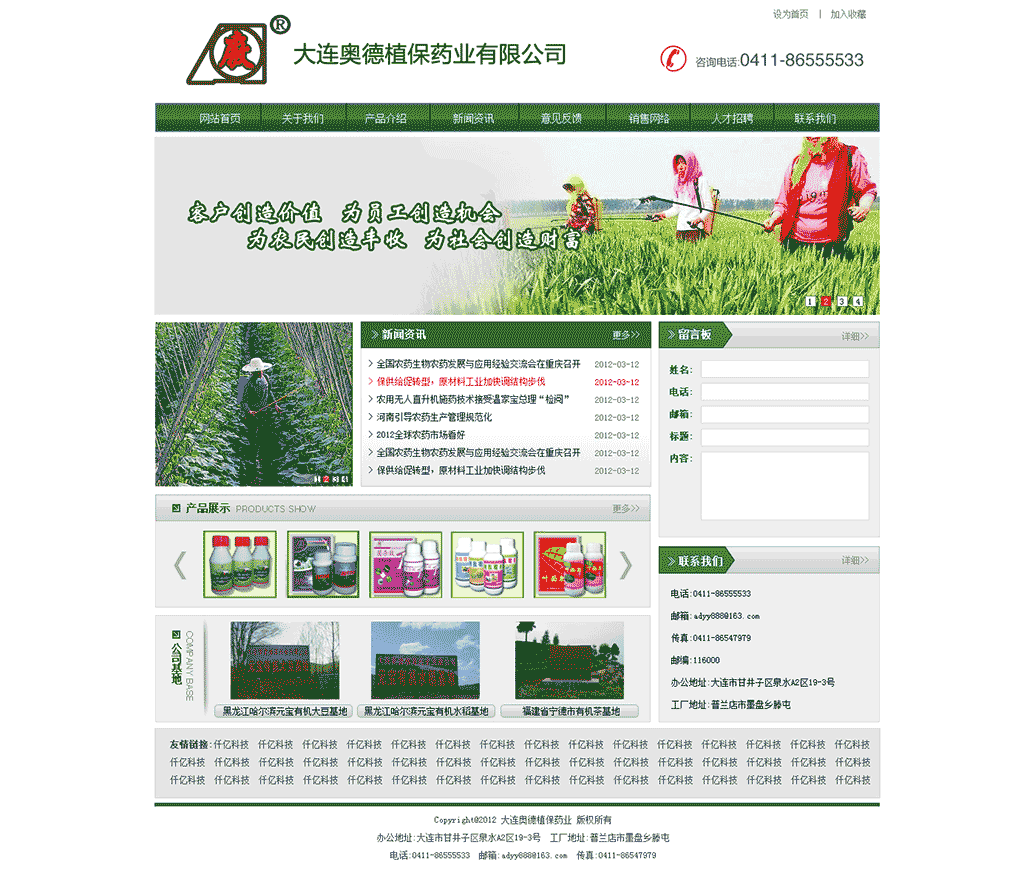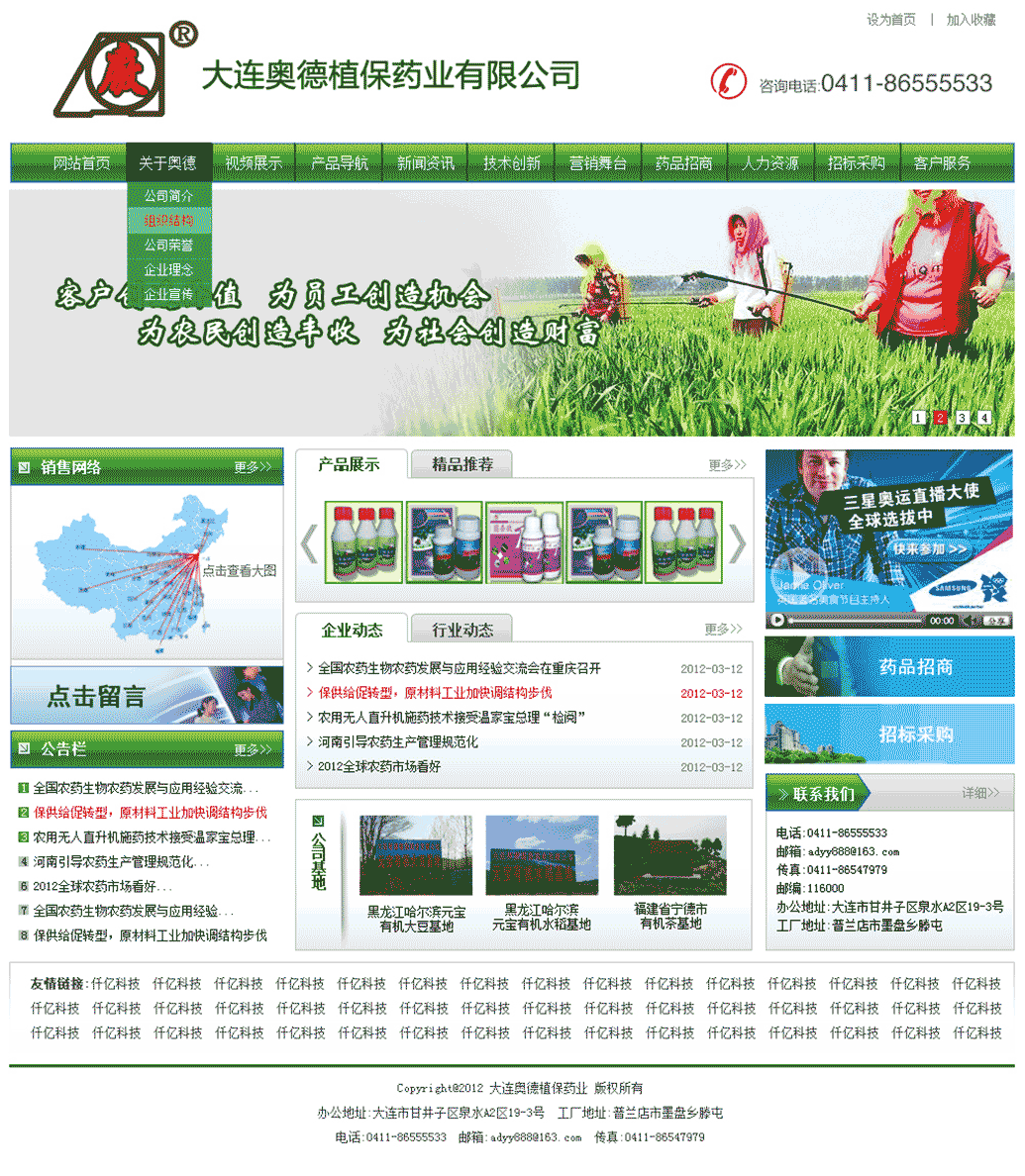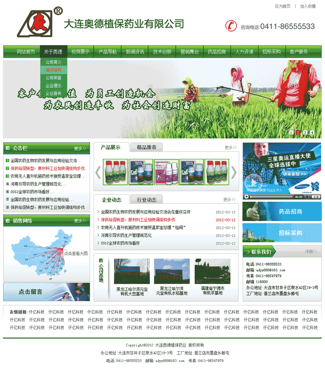 大连奥德植保药业有限公司是国家发改委核准的农药定点企业.主要从事有机农药及绿色、无公害的植物源、微生物源、海洋生物源等杀虫剂、杀菌剂、抗病毒剂和生物肥料的生产。总公司现有两个农药定点企业,一个生物研究所和六个植物医院构成...