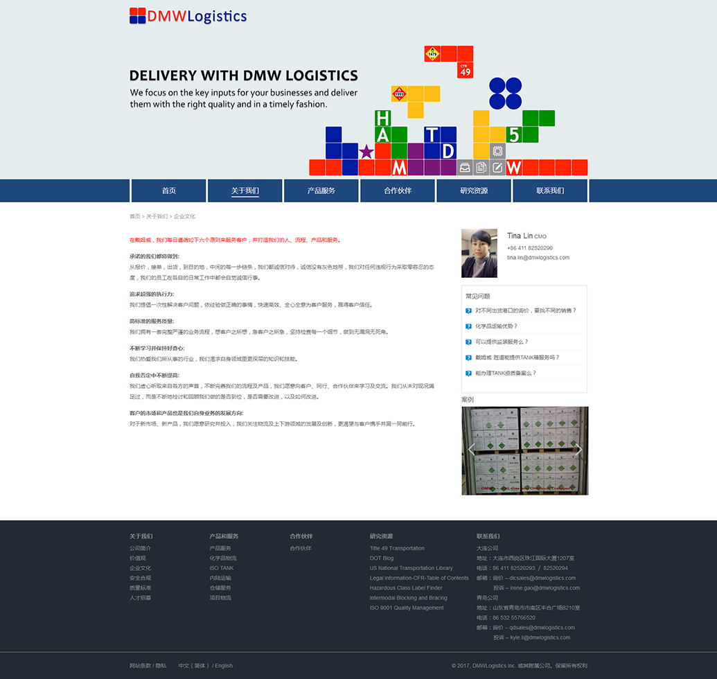戴姆威·胜道国际货运代理有限责任公司是经国家商务部批准的从事国际物流运输业的物流企业。中华人民共和国交通运输部批准的无船承运人。成立于2006年,公司承接海运、空运、陆运进出口货物的专业化国际物流运输业务,包括订舱、仓储、报关报检、货运保险、内陆运输等全方位服务。我司与MSK, COSCO, CMA, ZIM, HPL...