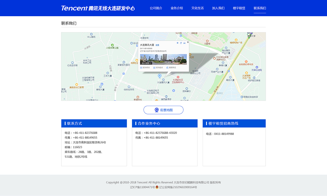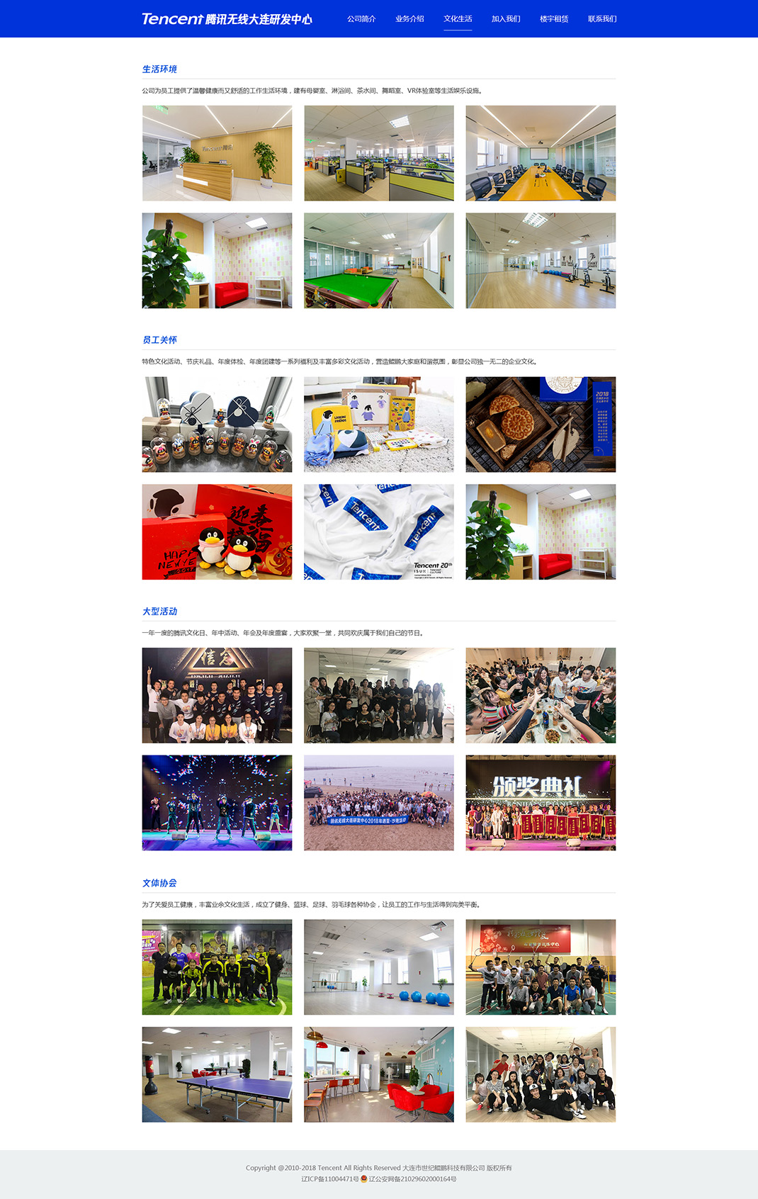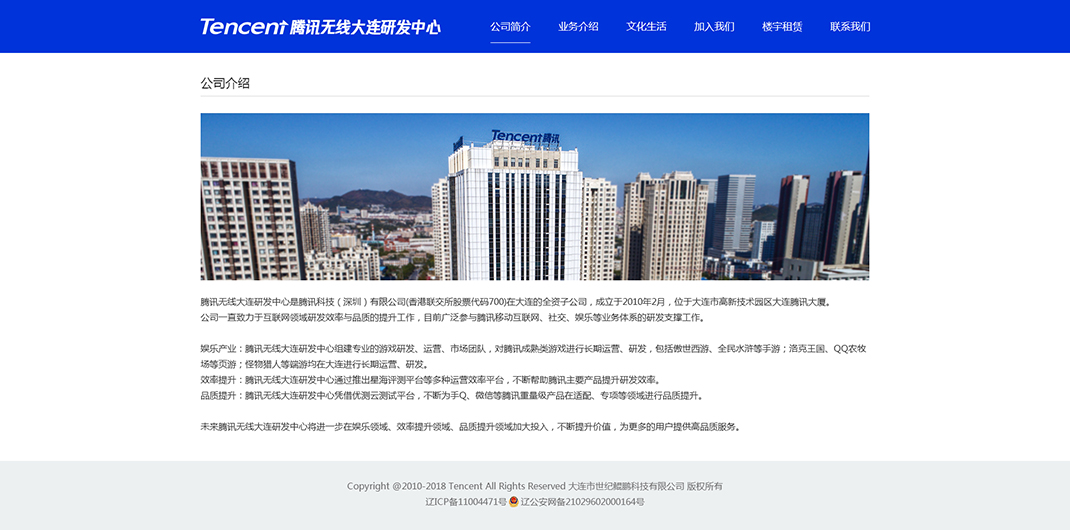 腾讯无线大连研发中心是腾讯科技有限公司(香港联交所股票代码700)在大连的全资子公司,成立于2010年2月,位于大连市高新技术园区大连腾讯大厦。 公司一直致力于互联网领域研发效率与品质的提升工作,目前广泛参与腾讯移动互联网、社交、娱乐等业务体系的研发支撑工作。