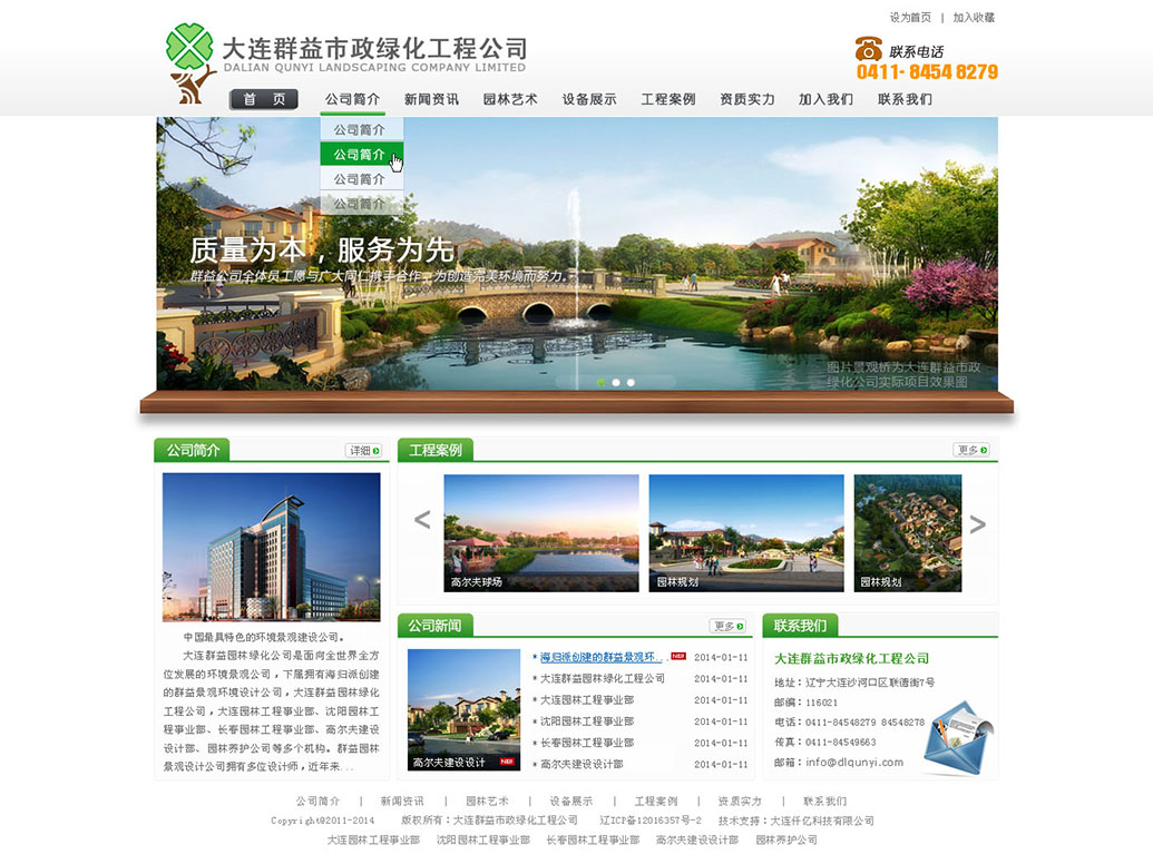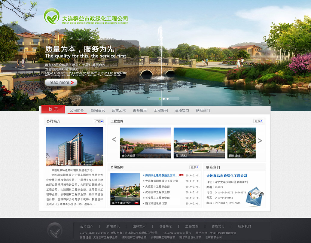 大连群益市政绿化工程公司成立于1994年,注册资金1000万元,年产值上亿元。具有园林规划设计资质、二级工程资质。 公司成立以来,先后从事了风景区规划、城市环境设计、居住区景观规划设计、城市广场、公园绿地、滨水绿地、高速公路景观、医院与学校景观等等各类型的工程。