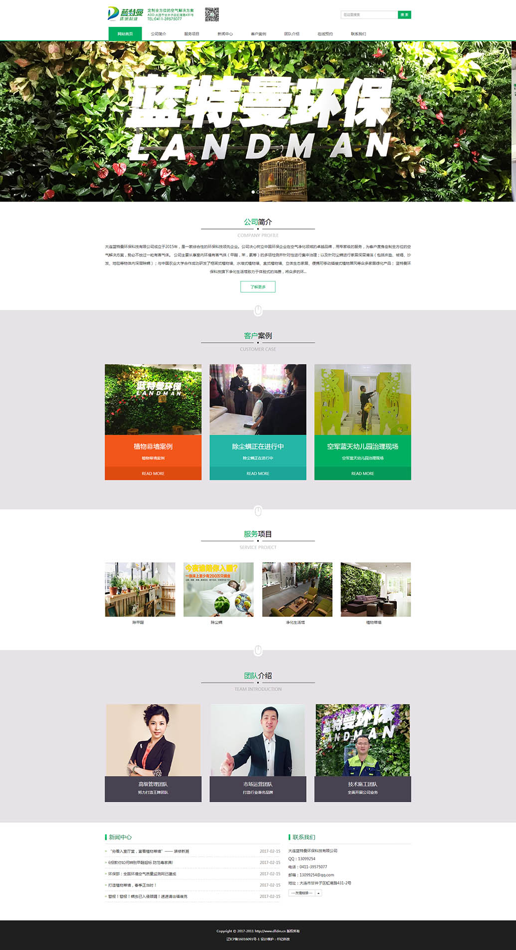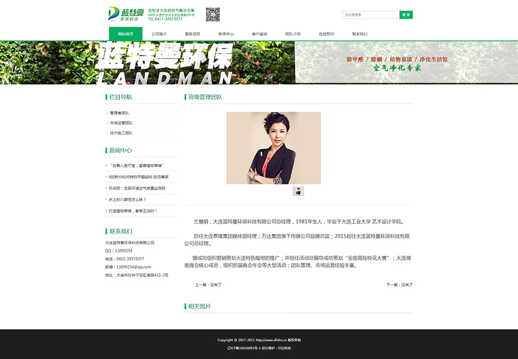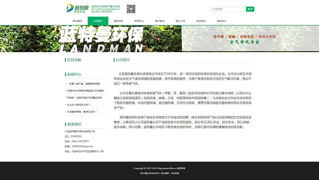 大连蓝特曼环保科技有限公司成立于2015年,是一家综合性的环保科技领先企业。公司决心树立中国环保企业在空气净化领域的卓越品牌,用专家级的服务,为客户度身定制全方位的空气解决方案,势必不放过一粒有害气体。公司主要从事室内环境有害气体(甲醛,苯,氨等)的多项检测并针对性进行集中治理;