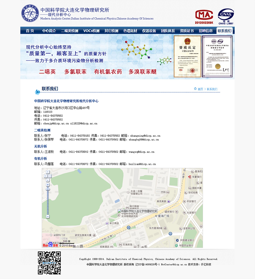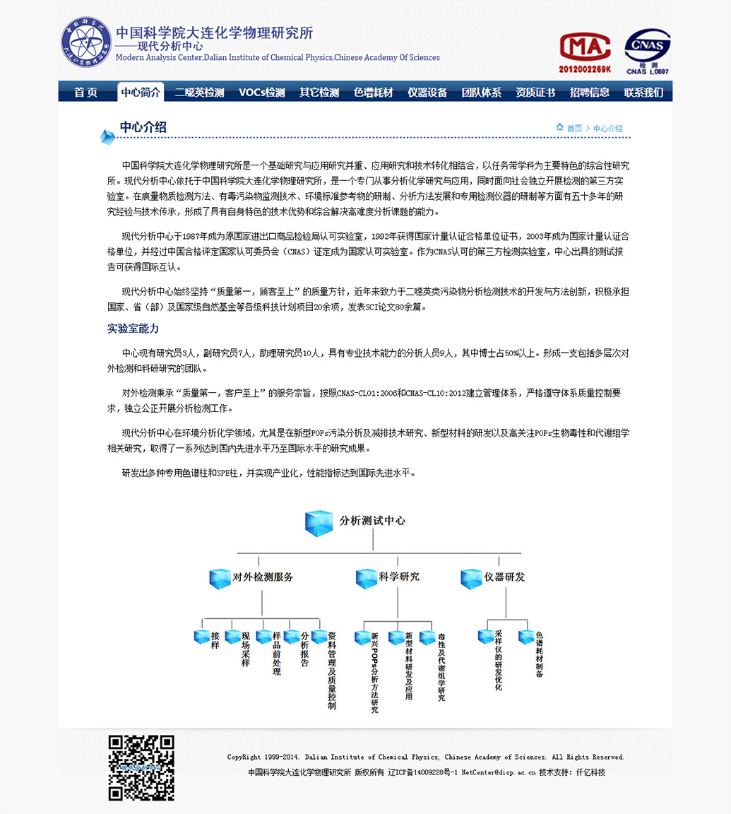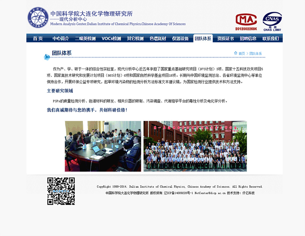 中国科学院大连化学物理研究所环境评价与分析研究组(103组)是一个集基础研究、仪器研发及对外服务于一体的综合科研平台,位于大连化学物理研究所生物技术楼(26#楼),现有研究员3人,副研究员11人,助理研究员3人,其它工作人员10余人,在读研究生20人,已经形成一支包括多层次研究的科研队伍和检测服务团队...